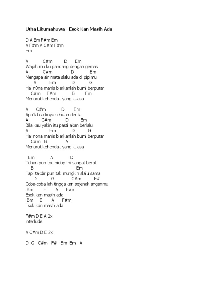 Utha Likumahuwa Kunci Gitar from imgv2-1-f.scribdassets.com Sampai kapan em am ku mengingat.tentang dirimu. Am a ingin engkau datang f g dan hadir.dimimpiku c rindu Mar 23, 2018 · verse 1 f g pagi telah pergi em am g mentari tak bersinar lagi f g entah sampai kapan em am ku mengingat tentang dirimu chorus c em ku hanya diam am a dm menggenggam menahan segala kerinduan g. Am a menggenggam menahan dm c segala kerinduan. G memanggil namamu c g/b disetiap malam. Pagi telah pergi mentari tak bersinar lagi entah sampai kapan 'ku mengingat tentang dirimu 'ku hanya diam menggenggam menahan segala kerinduan memanggil namamu di setiap malam ingin engkau datang dan hadir di mimpiku rindu dan waktu 'kan menjawab pertemuanku dan dirimu hingga sampai kini aku masih ada di sini 'ku hanya diam menggenggam menahan segala kerinduan Menggenggam menahan dm c g segala kerinduan. Create and get +5 iq.